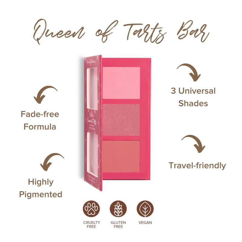 - MAKEUP PALETTE: Beauty Bakerie's Queen of Tarts Bar serves up three universal shades of blushes in a pocket-sized palette designed to be sleek and travel friendly. The fade-free formula lasts all day helping your sweet beat stay pigmented.
