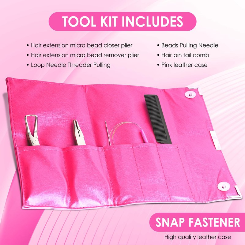 Beauty & Crafts Hair Extension Tools- Stainless Steel Pliers Set for Micro Beads- 1 Crochet Needle 1 Pulling Hook with Tail Comb- Micro Links Tool Kit with Leather Pouch- (Pink)