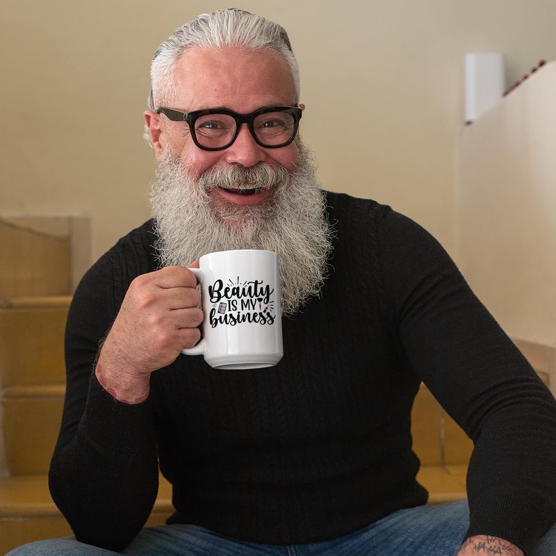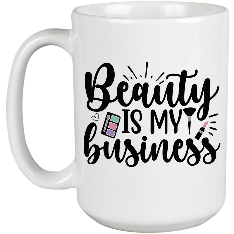 Beauty Is My Business with Eyeshadow Palette, Brush & Pink Lipstick Design - Beauty Themed Merch for Makeup Artist or Cosmetologist, Gift for Makeup Lovers & Beauticians, White Mug 15oz