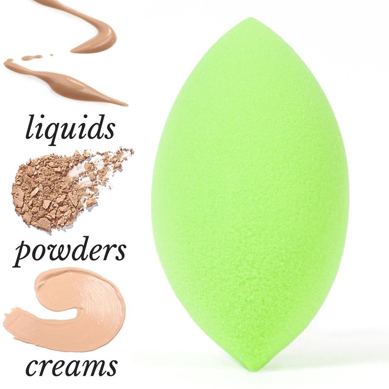 - Green Oval: The pointed ends make it super easy to apply foundation into the side of your nose and concealer around the delicate eye area. Just spray a few squirts of water onto the sponge and it works like a charm. Gives a better finish than using a brush.