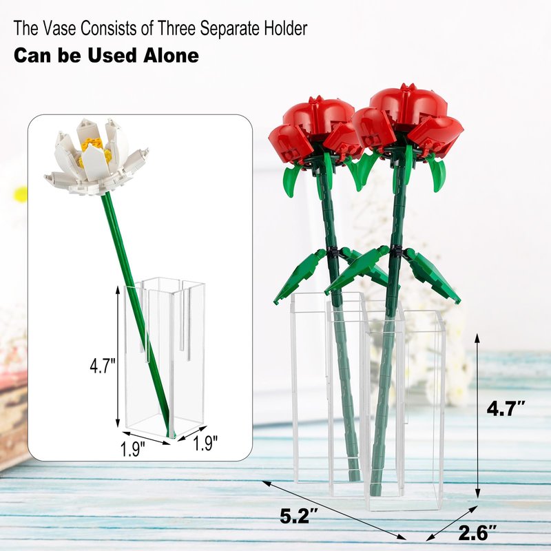 - 【Lego Flowers Vase Holder】The vase consists of three separate holders and can be used alone. The single holder size is 1.9*1.9*4.7IN, perfectly compatible with Lego flower building block kit.