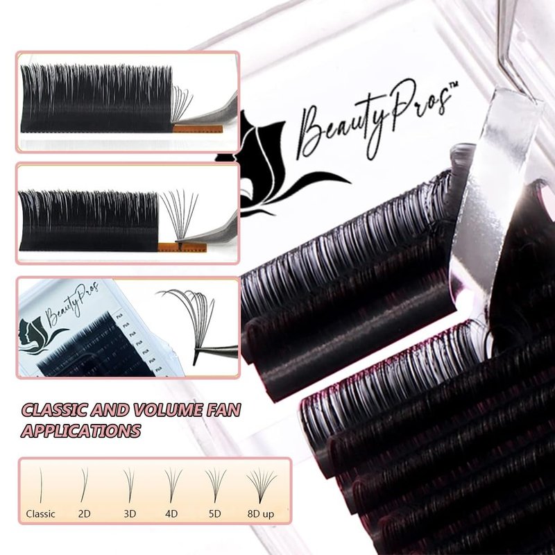 BeautyPros Professional Eyelash Extension Kit –Curl B,C,D,J & M Length (9-16mm) Volume Lash Extensions - Eyelash Extensions Supplies- Classic Lash Extensions Mix Tray 0.03,0.05,0.07,0.015 & 0.20mm Thickness Eyelash Fans-Black