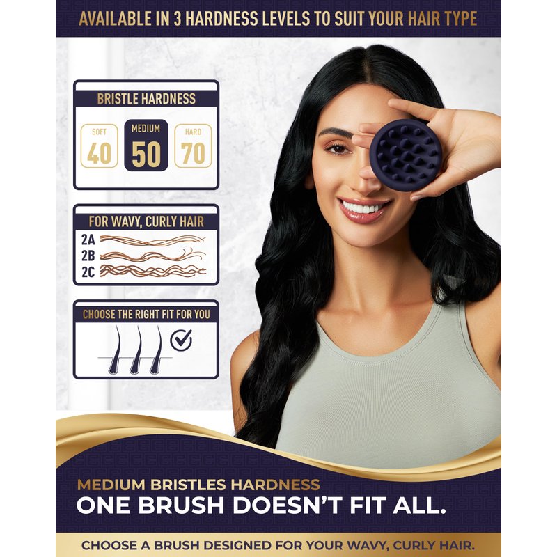 HARDNESS 50 HAIR MASSAGER SCALP MADE FOR WAVY & CURLY HAIR, our medium shampoo brush scalp massager, hair scalp brush & scalp exfoliator are different in every way. With a hardness level of 50 for medium, curly, wavy hair, this bristle is a medium firmness, the perfect balance between soft and hard, reaching your scalp easily without scratching or discomfort.