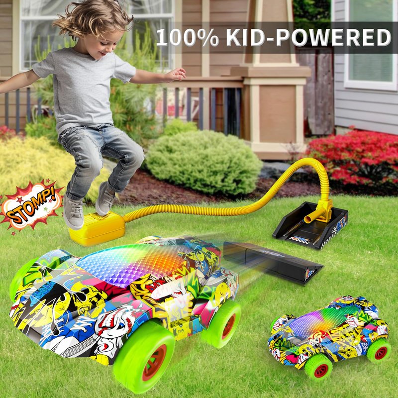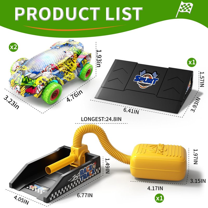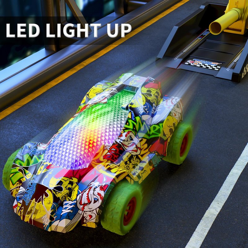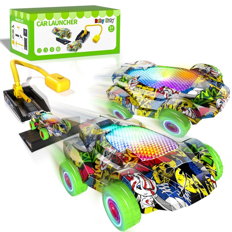 - Car Launcher Toys For Kids Boys: The car launcher toy including 2 racing cars with LED lights, 1 air-powered launcher and 1 ramp. The unique design of the air-powered launcher enables the car to fly out at a higher speed and a longer distance, stimulating children's curiosity and spirit of exploration about speed. Children can not only feel the passion of speed by launching cars, but also use the ramp to perform extreme tricks, adding excitement and challenges to their games.