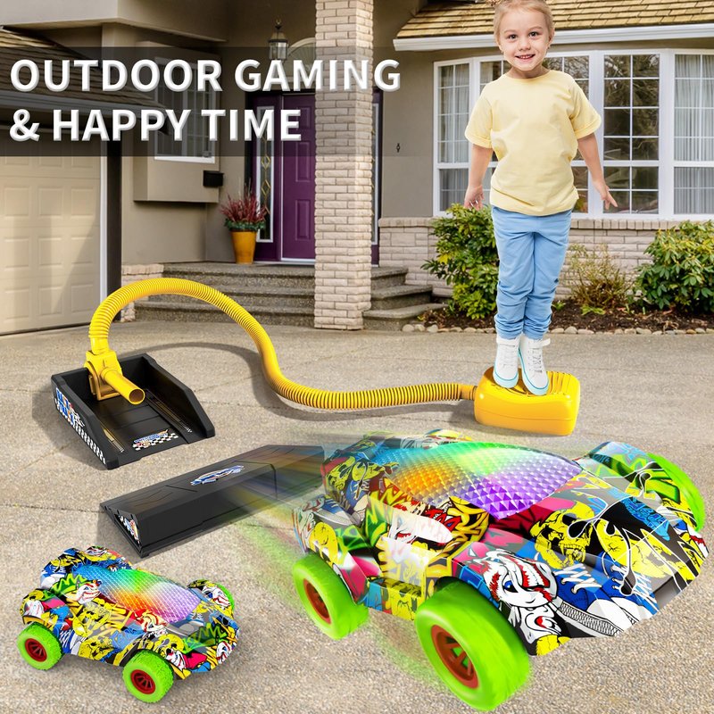 - Fun and educational: Children can try different launch angles and strengths in the game, observe the speed and distance of the car, and cultivate a spirit of scientific inquiry. By jumping and stepping on the launcher, children exercise their leg muscles while playing, improve coordination and balance, and contribute to overall healthy development. We encourage children to invite friends to play together, enhance social skills, cultivate teamwork spirit. Outdoor car launcher toys for kids boys.