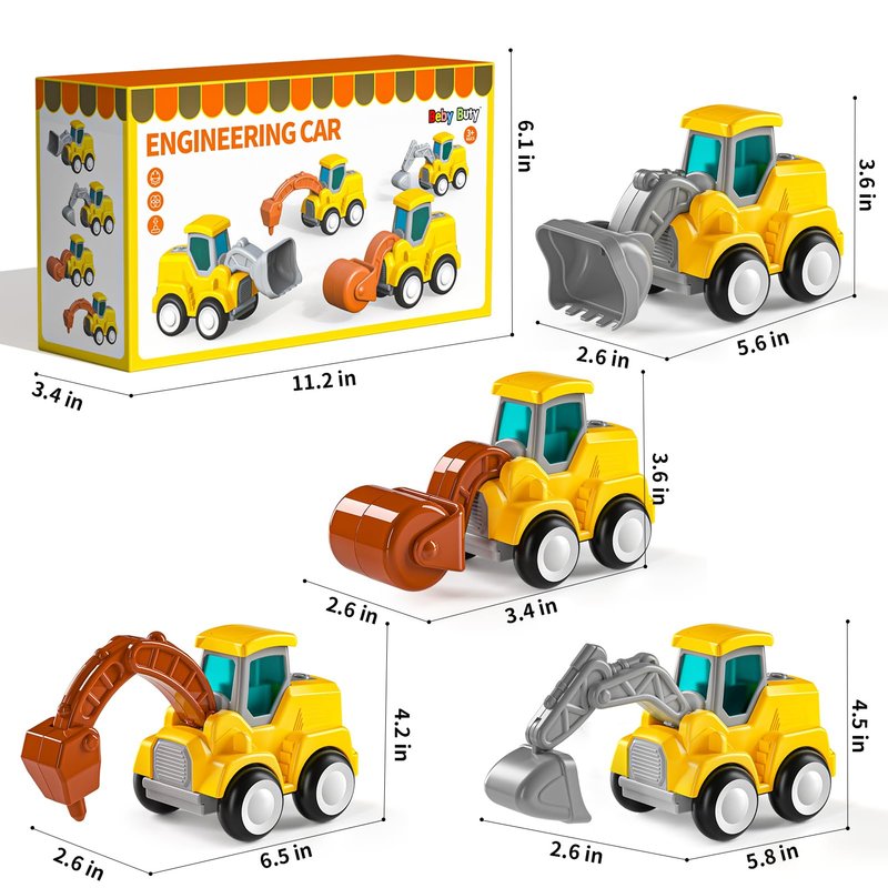 - 【Construction Trucks Set For Toddler】This construction toy set is ideal for toddlers who dream of becoming engineers, and includes 4 different heavy construction vehicles: an excavator, a bulldozer, a road roller and a drilling vehicle. Each toy cars for toddlers 3-5 is carefully designed with authentic appearance and operating functions, helping toddlers learn the basics of construction vehicles while having fun.