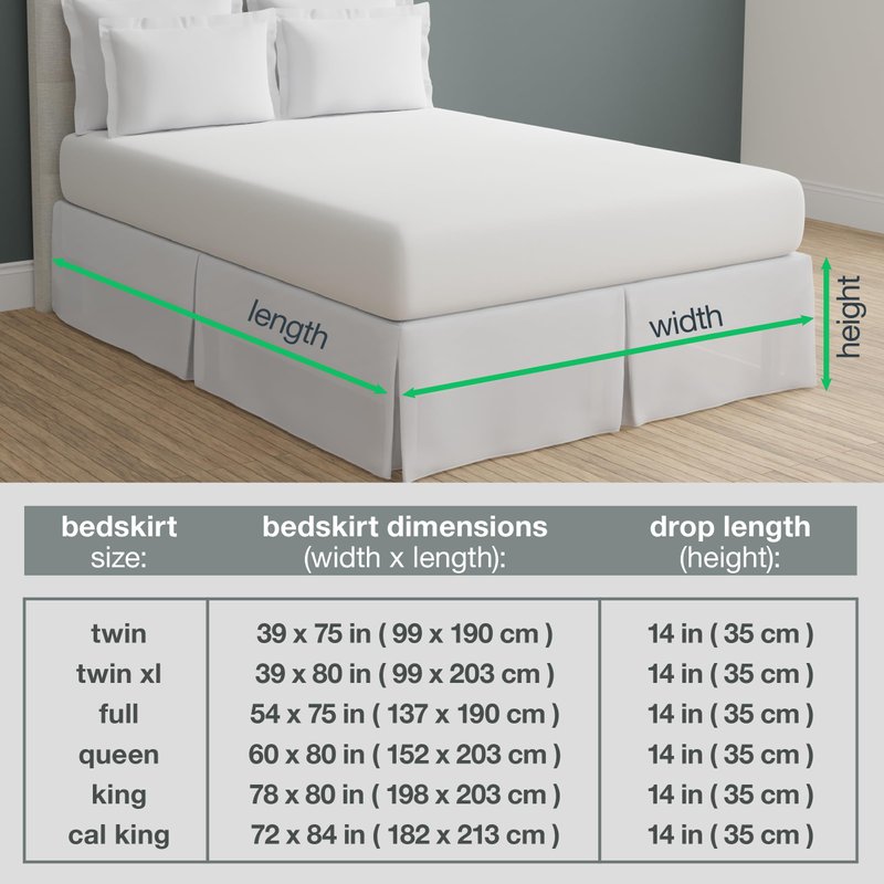 - Specifications: The queen-size measures 60” x 79” and has a classic 14” drop. The corners are pre-split to accommodate footboards and 4-post beds. Our bed skirt hides box springs, bed frames, and legs you’d rather not be visible