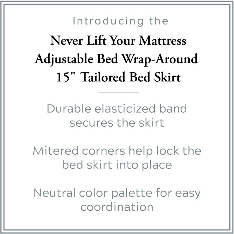 - Stays Put: The sturdy elasticized band and pre-split mitered corners ensure the skirt stays in place without sagging or shifting. This innovative bed skirt does not have a traditional fabric platform, so the mattress does not need to be lifted