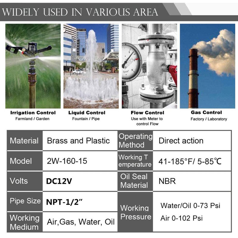 This valve is N/C (normally closed), meaning it is closed when power isn't supplied. The unit operates on 12V DC power and can withstand temperatures of 41-185°F. This unit fits a 1/2" NPT thread.