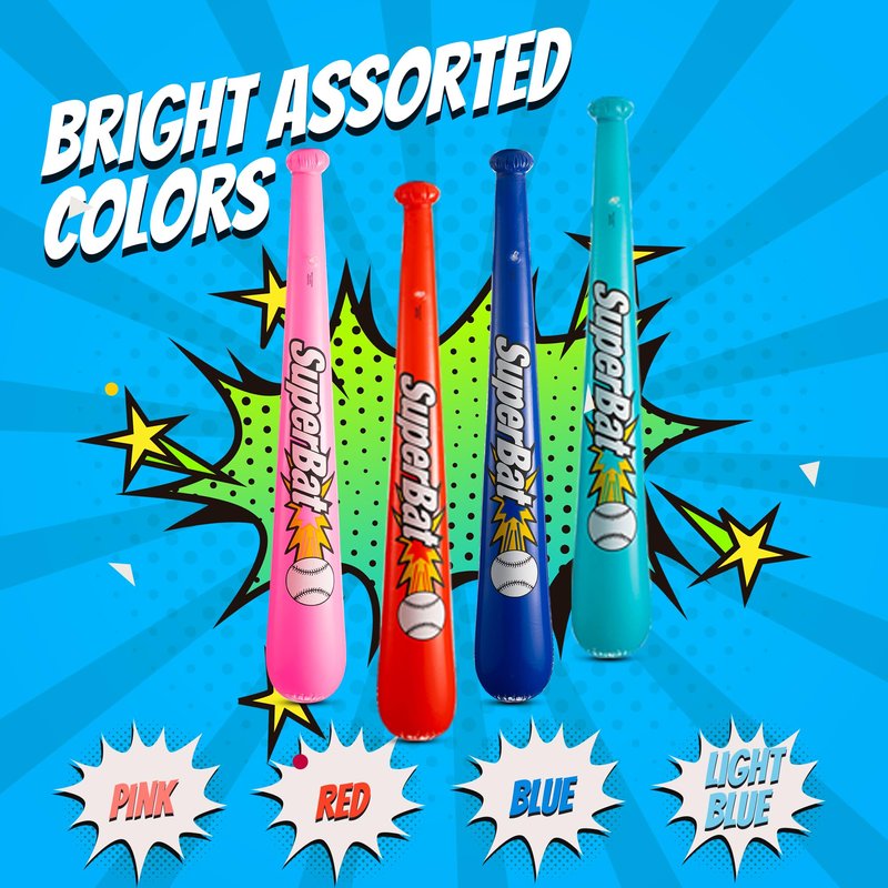 - PACK OF 12 INFLATABLE BASEBALL BATS Each pack of inflatable baseball bats in bulk includes 12 bats in a variety of bright neon colors. Including; Red, Pink, Blue, and Light Blue. When inflated each bat measures 42 inches tall