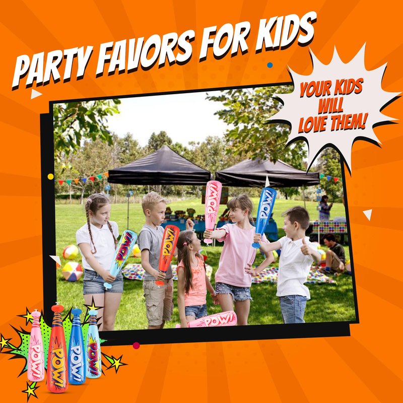 - PACK OF 12 POW BATS: Each order of inflatable baseball bats includes 12 bats in bright assorted colors. With every order, you will get 3 of each color: red, pink, blue, and baby blue. These inflatable bat toys feature the classic and iconic comic book superhero word pow on them