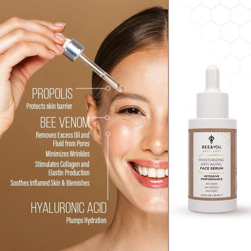 BEE and YOU Anti Aging, Anti Wrinkle Face Cream Serum, Dark Spot Remover, Moisturizer, Pore Minimizer Skin Care, Bee Propolis Extract, Raw Honey, Bee Venom and Hyaluronic Acid, 1.0 fl. Oz