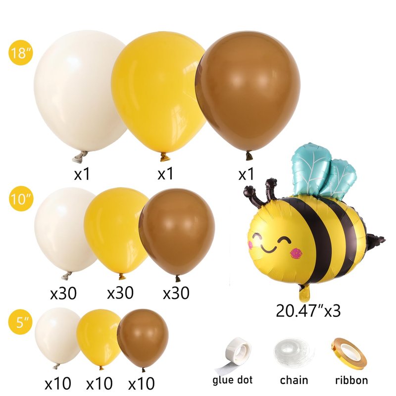 - Package Include: 90 pcs 10" balloons (30 mustard yellow,30 sand white,30 brownr), 30 pcs 5" balloons (10 mustard yellow,10 sand white,10 brownr),3 pcs 18" balloons(1 mustard yellow,1 sand white,1 brownr) ,3 pcs bumblebee foil balloon,3 pcs tools