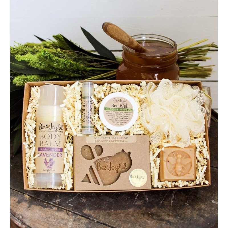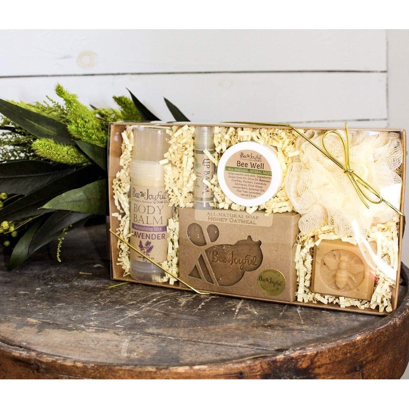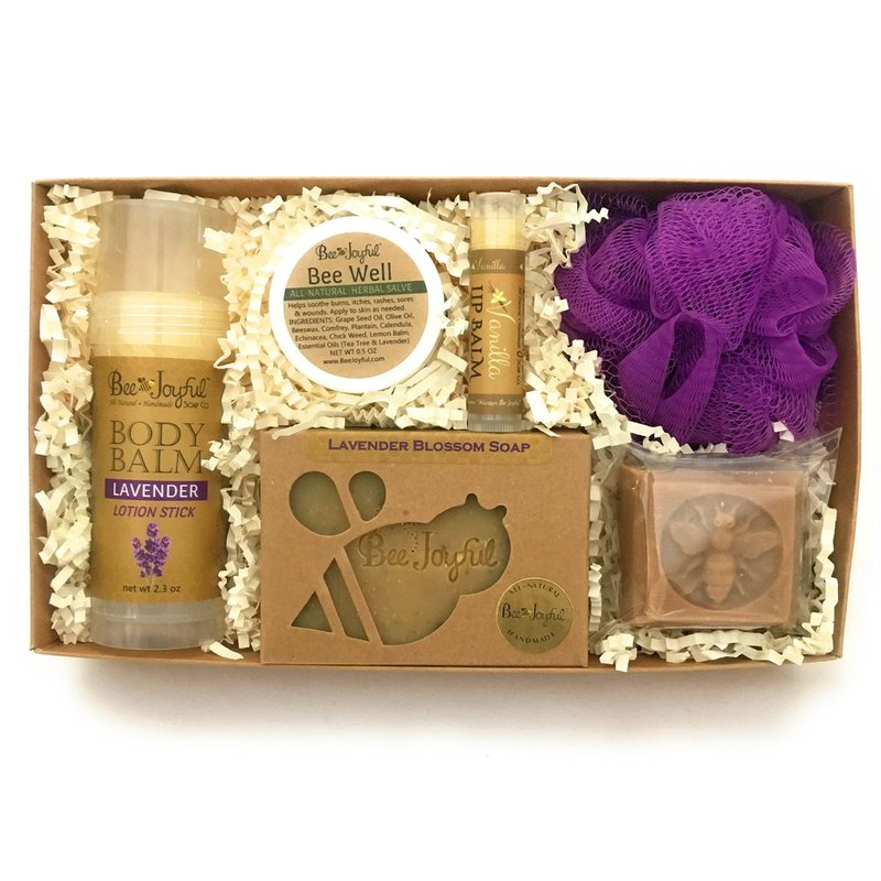 This Gift Box is made up of a variety of our most popular handmade items. This item includes: One Lavender Body Balm Lotion Stick, one Bar of "Lavender Blossom Soap", one Vanilla Lip Balm", one "Bee Well Herbal Salve" 0.5 oz. A smaller decorative bee soap and a purple colored bath pouf. NOTICE: Items that come in this gift box are as described here and may not match items seen in the image exactly. Bee Joyful products are all handmade with 100% natural ingredients, including beeswax, honey and pure essential oils. This is the perfect gift to bring joy AND clean healthy skin!