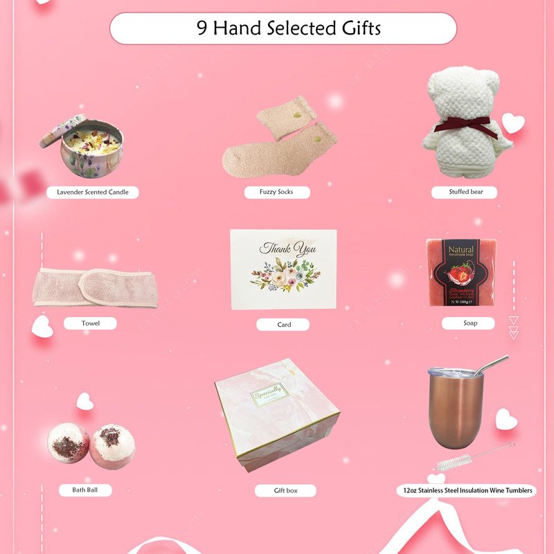 - 【PERFECT GIFT BOX FOR WOMEN FOR EVERY OCCASION】Every item in our birthday box for women has been selected with thought&care.It makes a ideal gifts for her Birthday, Valentine's Day, Anniversary, Retirement, Graduation, Christmas, Mother's Day,Wedding and Thanksgiving Day.Whether you're looking for gifts for mom, best friend, sister, girlfriend, wife, grandma, nurse, teacher, aunt, coworker - this spa gift basket for women is the best choice.The care package also nice self care gifts for women.