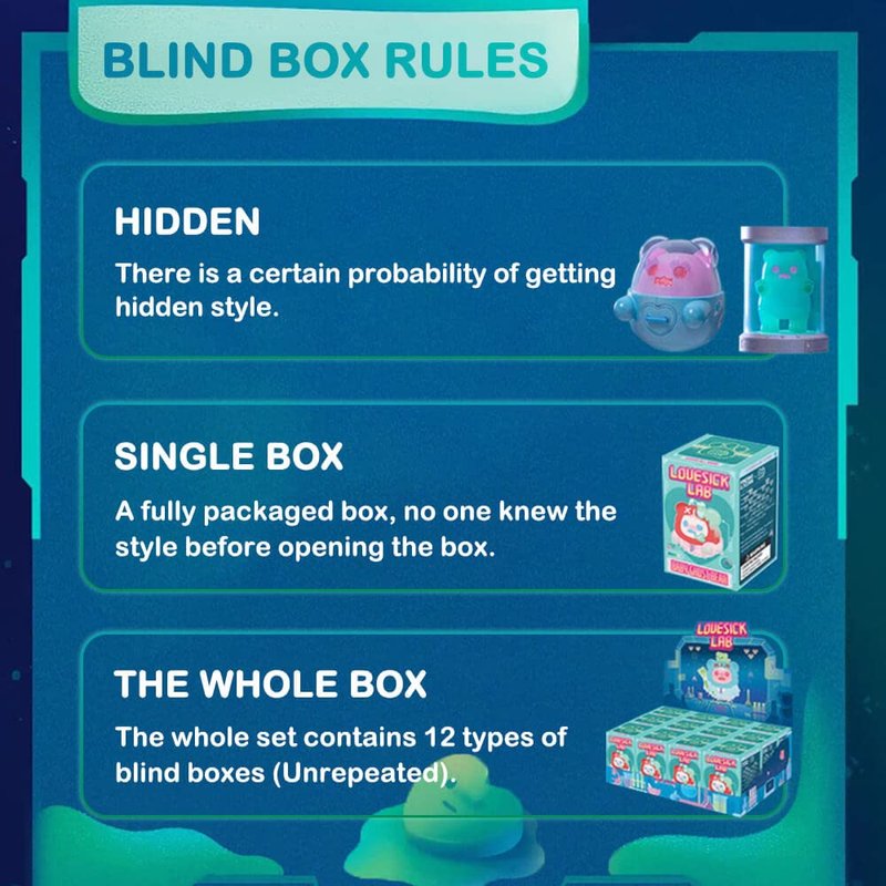 - 【About Random】NOTE: each blind box is randomly arranged. You may get the hidden edition in any single box in probability of (1/120 for Love Explorer and 1/240 for Isolated Patient). The whole set consists of 12 different figures.