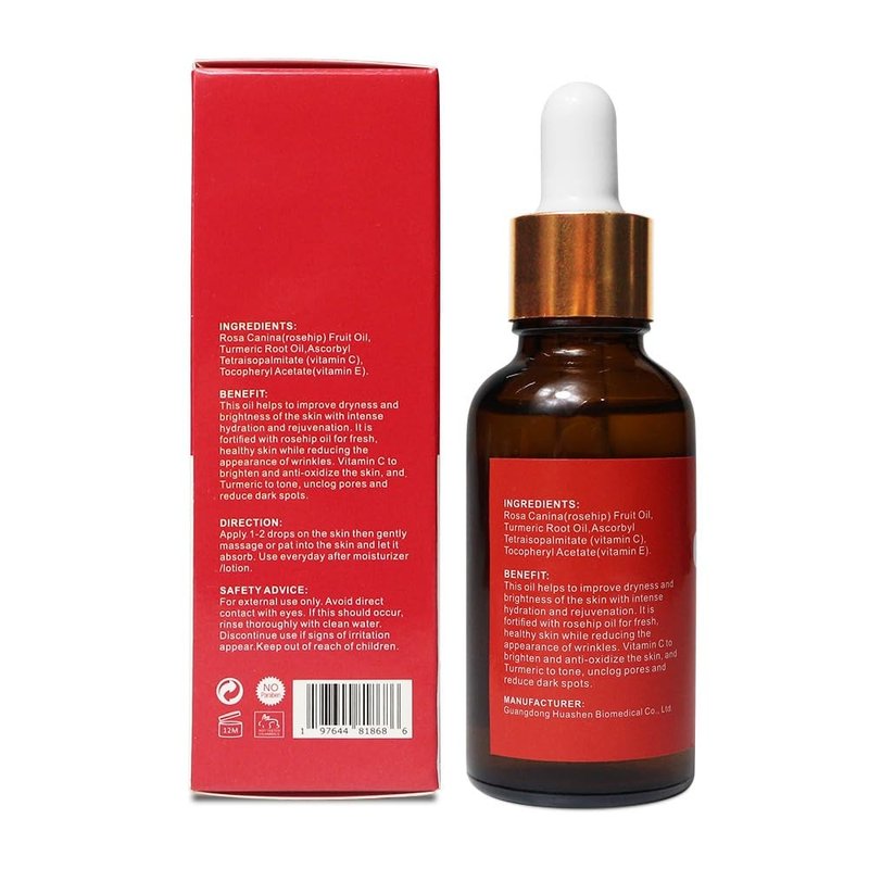 Introducing our luxurious Rosehip Face Oil Skin Care Serum, an exquisite blend of natural ingredients carefully crafted to nourish, rejuvenate, and enhance the beauty of your skin. This lightweight and fast-absorbing serum harnesses the power of rosehip oil, renowned for its exceptional skincare benefits, to provide you with a truly transformative experience. **Directions for Use:** After cleansing and toning your face, apply a few drops of the Rosehip Face Oil Skin Care Serum onto your fingertips. Gently massage the serum onto your face and neck in upward circular motions until fully absorbed. Use morning and evening as part of your skincare routine for best results. Reveal your skin's natural radiance and indulge in the luxurious benefits of our Rosehip Face Oil Skin Care Serum. Pamper yourself with this nourishing elixir and unlock the secret to beautifully hydrated, youthful, and glowing skin. Rosehip Face Oil Skin Care Serum infused with Vitamin C and Turmeric. This lightweight, non-greasy formula combines the hydrating and rejuvenating properties of premium rosehip oil with the brightening effects of Vitamin C and the anti-inflammatory benefits of turmeric. Deeply moisturize your skin, diminish fine lines and scars, and reveal a radiant complexion. Suitable for all skin types, this clean and ethical serum is your key to nourished, youthful-looking skin with a healthy glow. Unlock the secret to beauty with our Rosehip Face Oil Skin Care Serum enriched with Vitamin C and Turmeric.