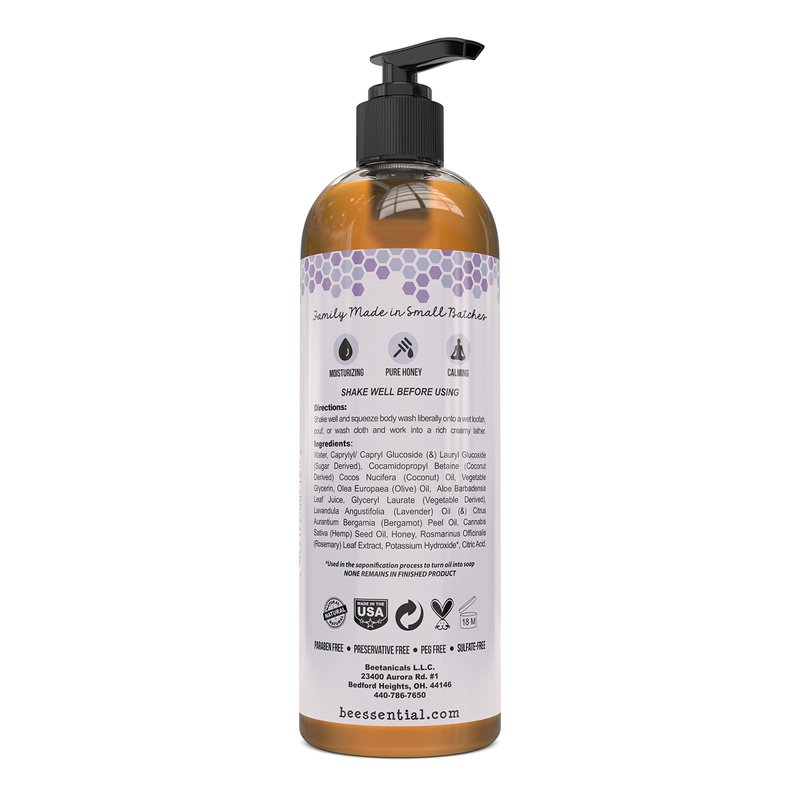 Beessential Natural Body Washes made with gentle Hemp, Honey and Aloe. Safe for Sensitive Skin. Our natural formula is Paraben, PEG and Sulfate-Free, and made with pure, plant-derived ingredients like Vegetable Glycerin. Beessential's moisturizing body washes cleanse with ultra-hydrating Coconut, and Olive Oils while creating a rich, luscious lather your soft, healthy skin will love to indulge in.