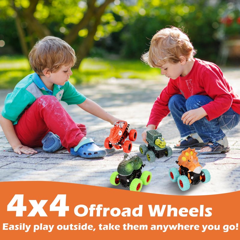 - 4 Pack Push and Go Dinosaur Monster Truck Toys for 2 year old boys
