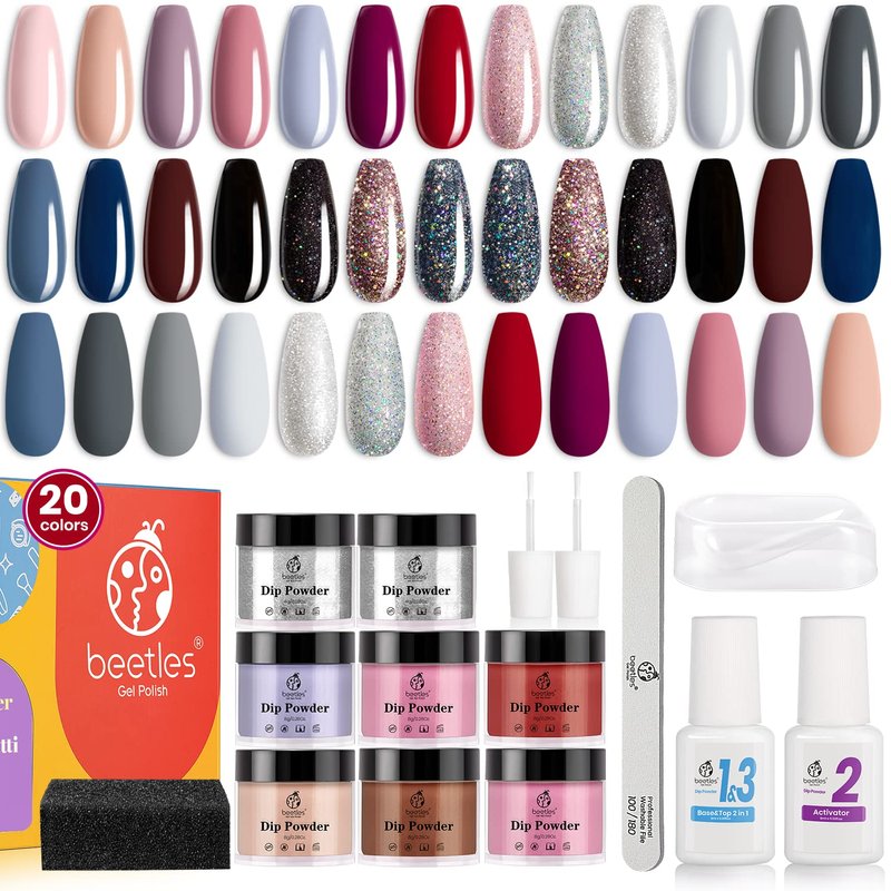 - HEALTHY & HARMLESS: Beetles' 20 colors nude gray pink blue glitter dipping powder set is made with a healthy, natural formula to help nails grow stronger and healthier. These don't damage the nail bed and are available for air-drying. The set includes 6× Smooth Non-yellowing DIP POWDER, 1× BASE & TOP 2 in 1, 1× Activator, 1× Recycling Tray, 1× Sponge, 1× Nail File, and 2× Spare Brushes.