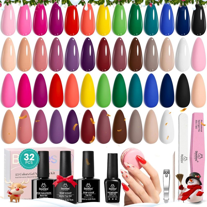 Beetles Gel Nail Polish 25 Colors Gel Polish Set Nude Blue Pink Red Gel Polish Chic Outfits Collection with 3Pcs Base Top Coat Gel Winter Christmas Manicure Kit Salon DIY Home Gift for Women Girls