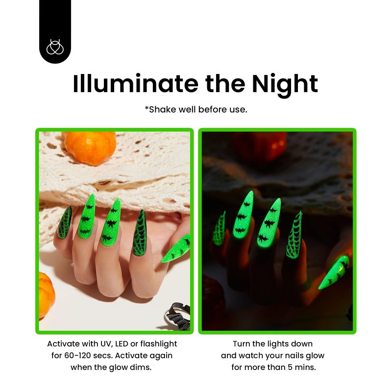 - Glitter Green Glow: After being irradiated by light, beetles fluorescent green gel polish glow-in-the-dark gel nail polish can keep the glow in the dark. With your inspiration, design more fun ways to add festive spirit and enjoy the fantastic glow at night!