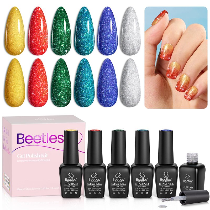 Beetles Glitter Gel Nail Polish, 6 Colors Red Blue Green Gel Nail Polish Set Soak Off Uv LED Nail Lamp Reflective Glitter Nail Art DIY Home Nails Perfect for Women Manicure
