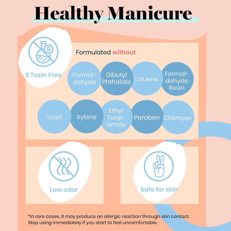 - Environmental & Healthy: 9 Toxin Free Ingredient makes it healthy and low odor. No harsh ingredients or adhesives that lead to damaged nails.