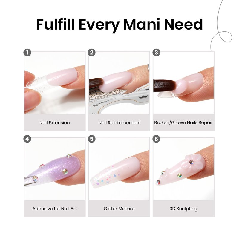 - Quick Building and Long Lasting: The builder gel can Build Beautiful Nail Extensions in 3 minutes even for a beginner! Lasts up to one month when applied appropriately. With a proper application, 2 WEEKS+ wearing is attainable.Package: 6*15g Poly Extension Nail Gel in 6 different colors.