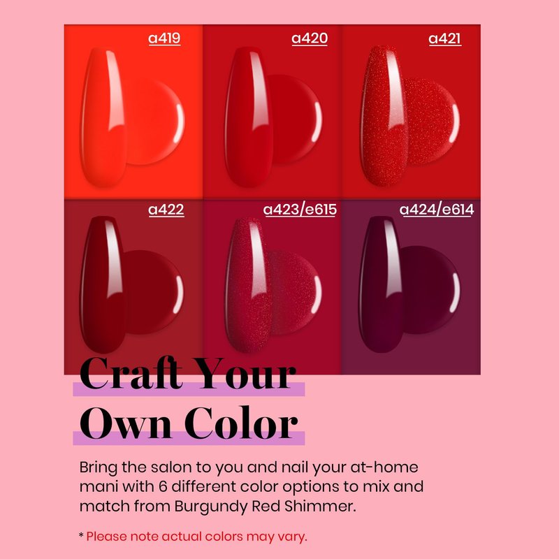 - 6 Bloody Mary Gel Polish (6*7.5ml / 0.25 fl.oz): We have put together the top 6 trendiest colors of red! We studied the upcoming color trends closely so you can display a colorful, stylish, modern manicure every time for the holiday! It comes with Shimmer Red and Burgundy Red gel nail polish for DIY at home. Perfect for girlfriends and women as a gift. Color Numbers are: a419-a420-a421-a422-a423-a424. A good choice for Women Gifts.