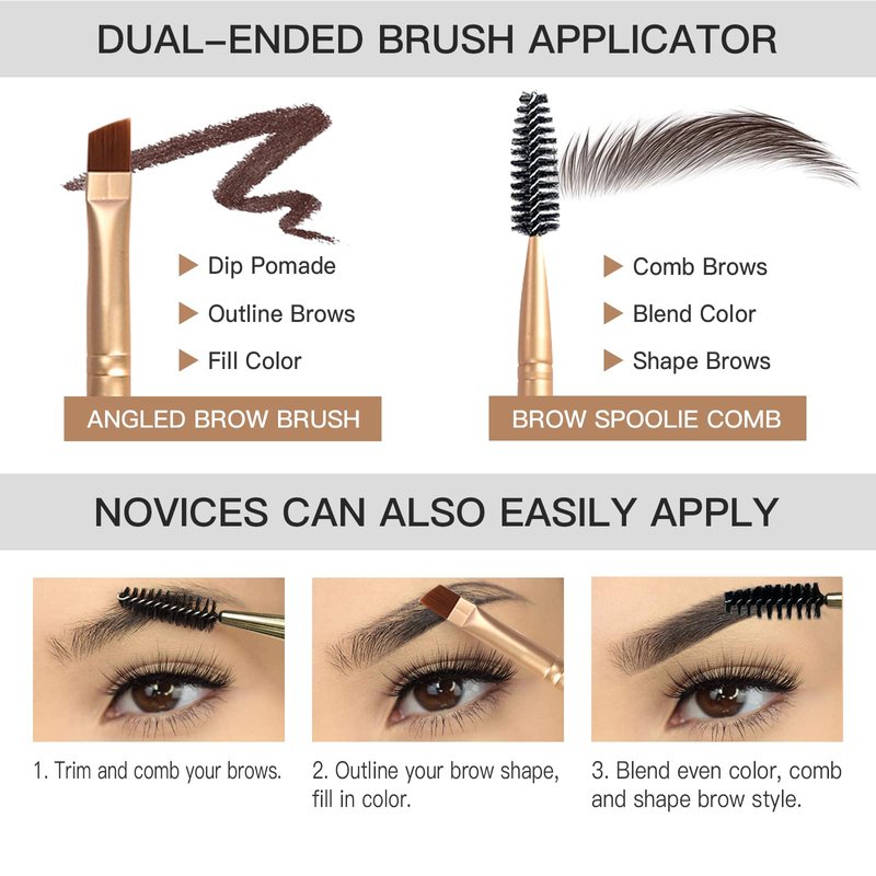 - 【Dual-ended Eyebrow Brush】Eyebrow Pomade Kit includes a high-quality dual-ended eyebrow brush. It features two different brush heads - one end has an angled brush that allows you to precisely fill in your brows, while the other end has a spoolie brush that blends the product well. It only takes a few seconds to create dimensional and natural eyebrows, perfect for beginners and ladies who are not good at makeup.