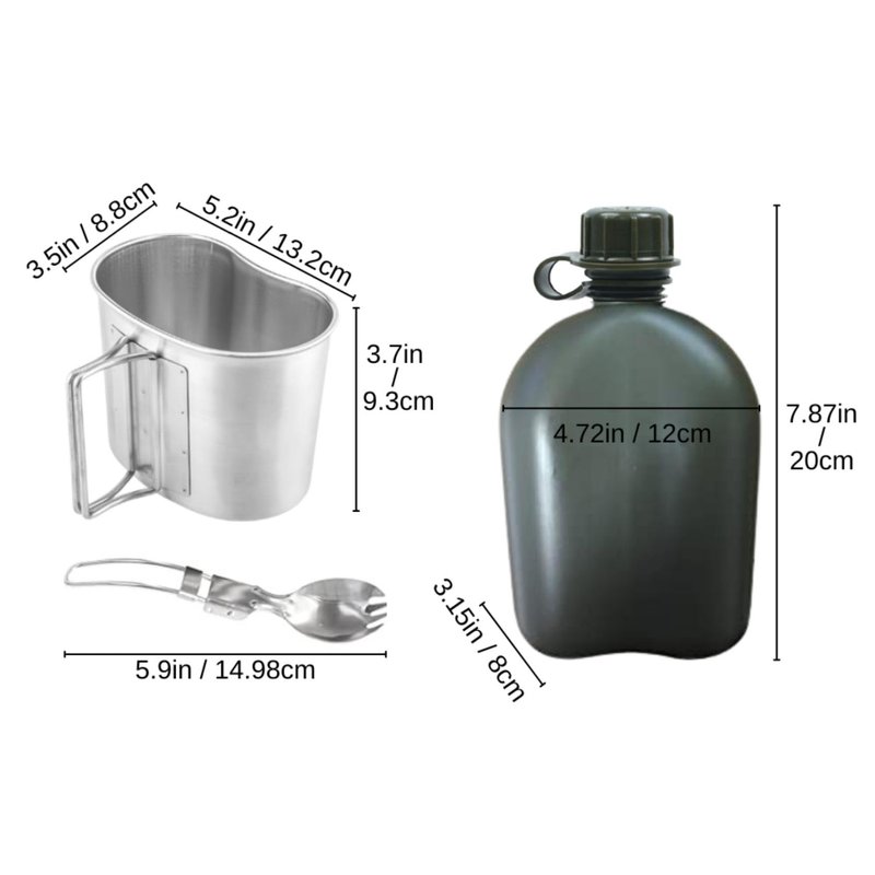 BeGrit Military Canteen Army Canteen WWII US G.I. Style Canteen Kit with Aluminum Cup Stainless Steel Foldable Spoon Fork for Hiking Backpacking Camping, 1 Quart Green