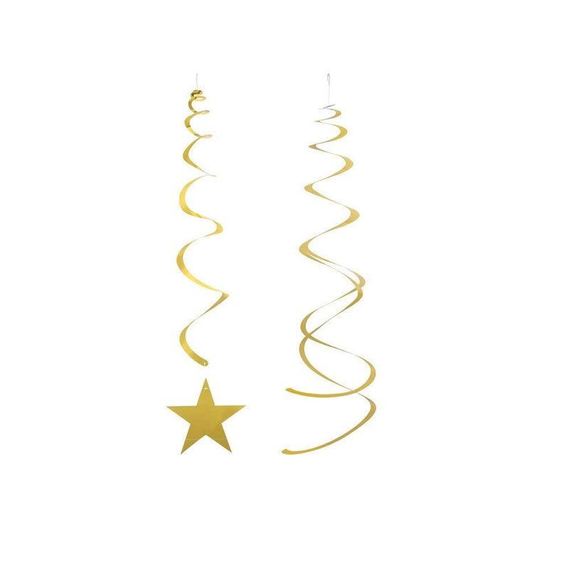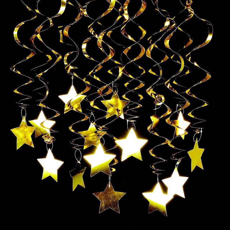 - PACKAGE INCLUDE: A total of 15 pcs hanging swirl decorations, including 15 gold double swirls and 15 swirls with PVC star. There are 15 strings in total, each of which is connected with a gold double swirls and a gold PVC star. Flexible swirls, hanging length can extend to approx 36"/91cm long.