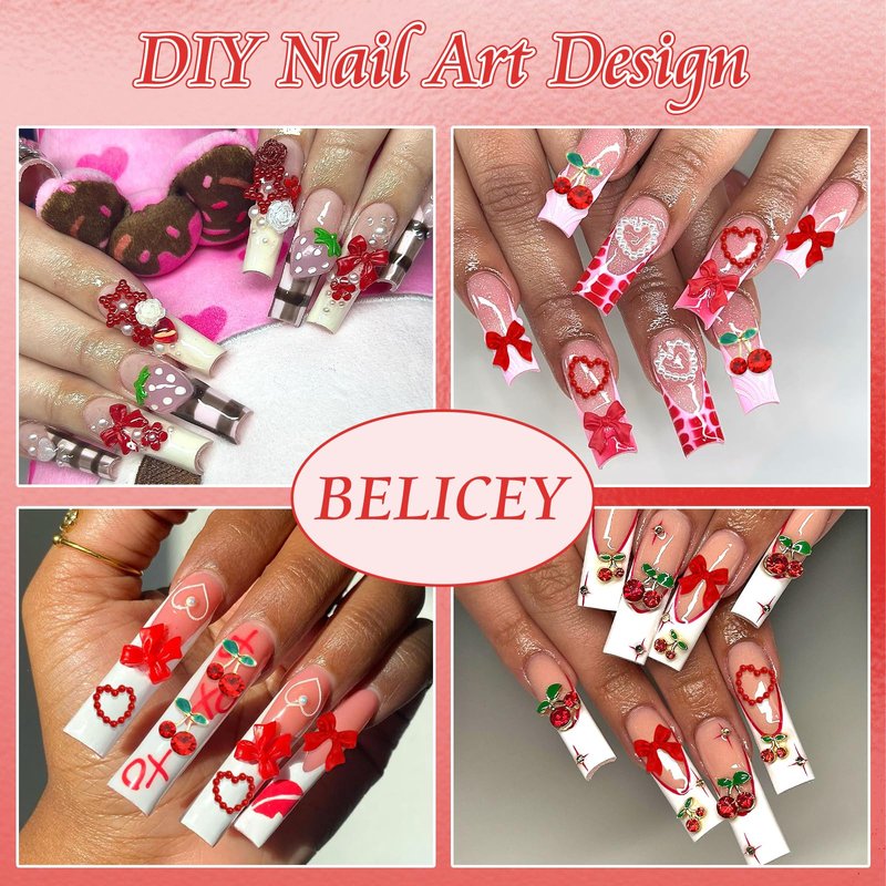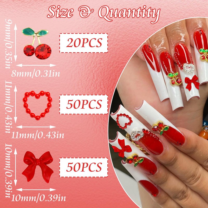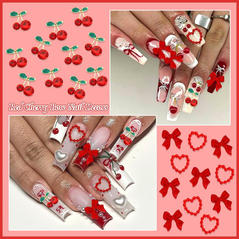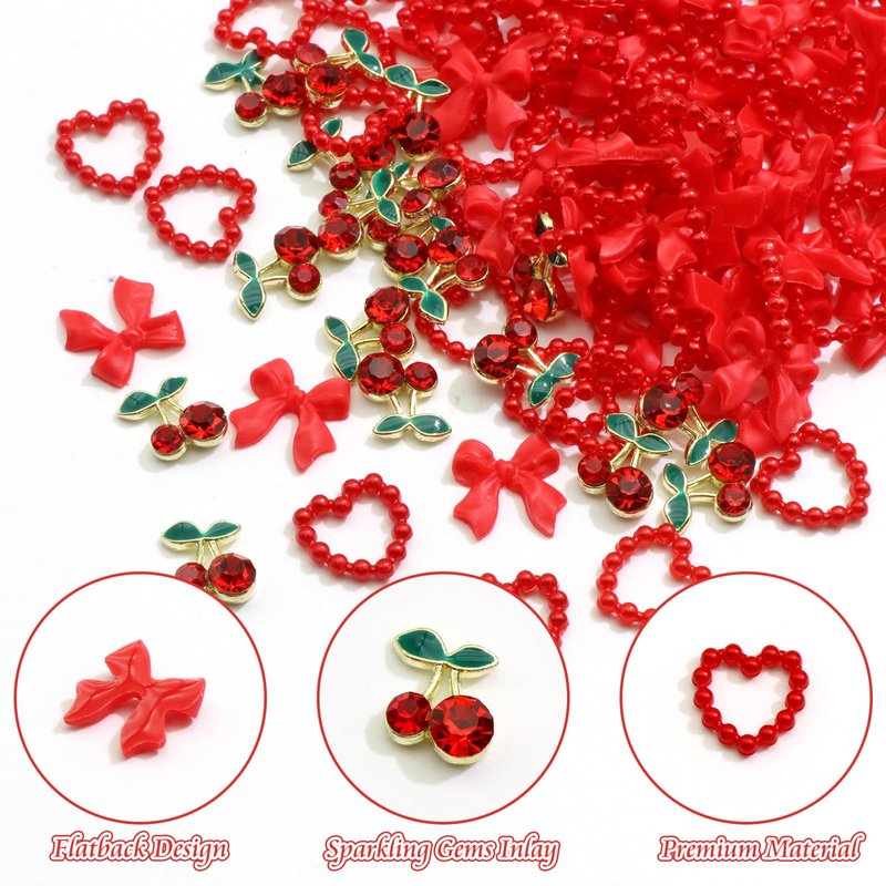 - What You Will Receive: You will receive a package of Assorted Red Nail Charms. Built-in various shapes, can meets your daily needs. There are about 3 styles(cherry/bow/heart), 120pcs in total. Some of the cherry nail charms also have shiny red gemstones set on them. These Cute Nail Charms are in variety of styles, which can help you design all kinds of nail styles you want!