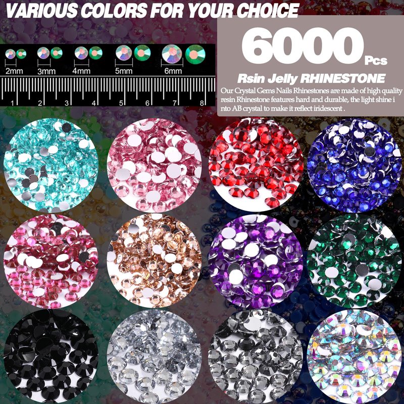 BELICEY Nail Arts Rhinestones 6000Pcs Flatback Jelly Bulk Rhinestones for Crafts Mixed SizeCrystals Gems Stones Round Beads Flatback Rhinestones for Nail Accessories DIY Diamond Painting Makeup Clothes Decoration