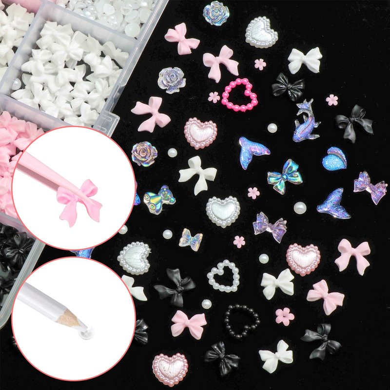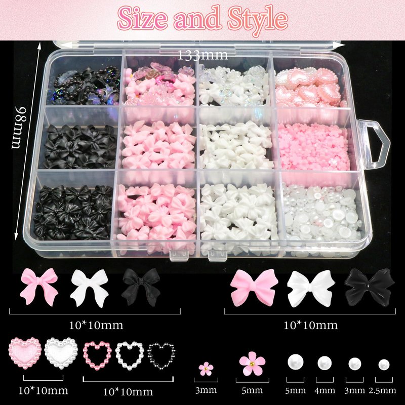 - 🎀Vaious Shape&Size:This set contains different style cute charms,including bowknot nail charms,3d heart, flower shape charms and flatback pearl beads in pink and white color.For each style,there are enough quantity and different size for you to choose.