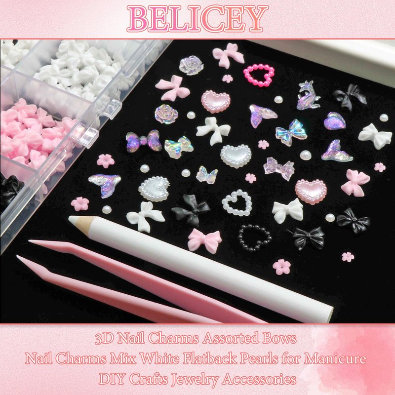 BELICEY 600PCS 3D Nail Charms and Flatback Pearls 3 Colors Bows Nail Art Charms Flower Heart Shaped Nail Charms Cute Kawaii Pretty Nail Beads Charm for Manicure DIY Crafts Jewelry Accessories