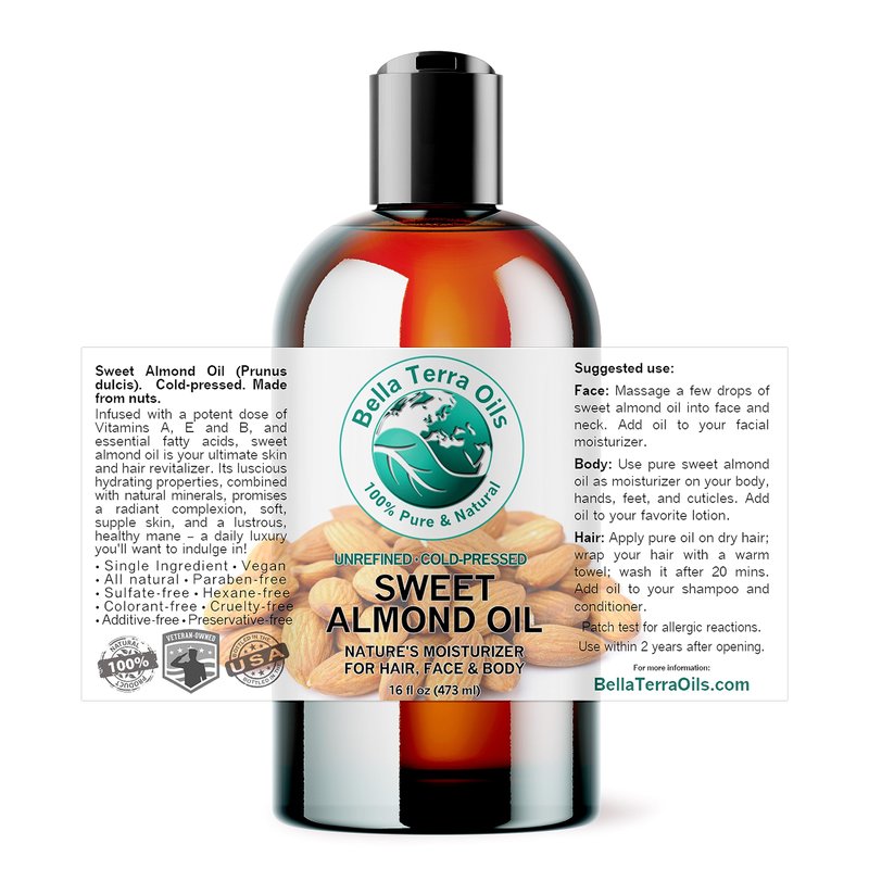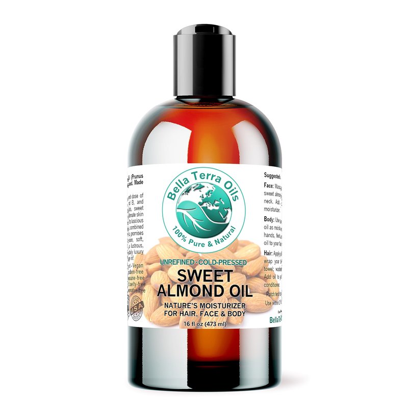 Bella Terra Oils - Organic Sweet Almond Oil 16 oz - Harnessing Almond’s Rich Vitamin A & B Profile, Cold-Pressed, Ideal for Radiant Skin