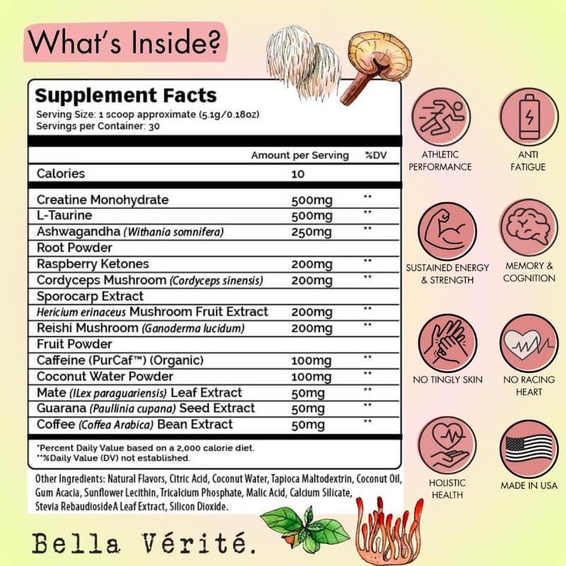 Elevate your workout routine with our Bella Vérité Phyto Stim, a natural preworkout powder designed to enhance your energy, endurance, & focus. Our plant-based, vegan supplement is an essential addition to your gym bag. With a delicious gummy bear flavor, it transforms your pre-workout drink into a tasty treat that fuels your fitness journey. Our Phyto Stim is powered by a unique blend of Yerba Mate, Ashwagandha, & a trio of powerful mushrooms: Reishi, Lion’s Mane, and Cordyceps. These natural ingredients work synergistically to enhance your performance, providing sustained energy & endurance without the crash or jitters. The addition of 100mg of natural caffeine from Green Coffee Bean Extract & Guarana Seed offers a clean, steady energy lift, ideal for powering through intense workouts & running sessions. It is designed to support women's & men’s health and fitness goals, offering clean, plant-based nutrition without any fillers, sugar, sucralose, or gluten. It’s a healthy choice for those who prioritize natural supplements in their daily regimen. The inclusion of coconut water powder & raspberry ketones further enhances its nutritional profile, ensuring you stay hydrated and energized during your workouts. Our preworkout powder is easy to use: simply mix one scoop with 6–8 ounces of water or add it to your favorite smoothie 30-45 minutes before physical activity. Ideally taken on an empty stomach, it’s great for those early morning workouts or afternoon energy slumps. The fast-absorbing blend ensures you get the nutrients you need right when you need them, enhancing both your physical and mental performance. At Bella Vérité, we believe in transparency and quality. That’s why we meticulously disclose every ingredient in our products, all of which are naturally sourced and extensively researched. Our Phyto Stim preworkout powder aligns with your health and skincare standards, making it a trustworthy choice for your daily sports nutrition needs.