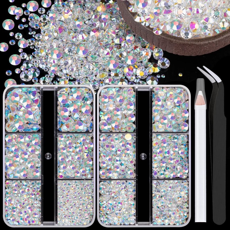 💎PACKAGE CONTENT——This resin rhinestone kit includes 2 boxes, each with 6 grids, featuring a variety of sizes: Box #1 contains 2mm x 1 grid, 3mm x 1 grid, 4mm x 1 grid, 5mm x 1 grid, and 6mm x 2 grids; Box #2 contains 3mm x 2 grids, 4mm x 2 grids, and 5mm x 2 grids. A tweezer and 1 pickup pencil are included for easy picking up of rhinestones. This set offers more large-size gems, making it perfect for DIY craft decorations, eye makeup, face makeup and nail art .💎VIBRANT GEMS FOR CRAFT——Made of resin instead of glass, these rhinestones are lightweight, durable, and economical. Designed with perfect facets, these high-quality jelly gems have a delicate and exquisite shine, enhancing the appeal of your crafts or nails with their vibrant colors. The AB coating is firmly combined on the outer surface of each rhinestone, which can have different color performances under different light or different refraction angles, providing long-lasting sparkle.💎INDEPENDENT LID FOR EACH GRID——The 6-grid box features 6 individual lids, ensuring that each compartment is completely separate from the others. This design allows for easy organization of various sizes of resin rhinestones without the worry of mixing or spilling.💎TIPS FOR USE——Non-hot fix jelly flatback gemstones require adhesive for nail art, crafts, or artwork design. We recommend using B7000 rhinestone jewelry glue for DIY projects and UV / quick dry nail glue for nail art. To apply the resin rhinestones, first, clean the surface of your nails or the crafts you wish to embellish. Then, apply the rhinestones with the appropriate glue and wait for them to dry. (Please note that glue is not included.)💎WIDE APPLICATION——These sparkling iridescent resin rhinestones are perfect for creating dazzling looks. Use them for face makeup, eye makeup, body art, 3D nail art or bedazzling DIY crafts like shoes, tumblers, mugs, bottles, phone cases, popsockets, scrapbooks and more.