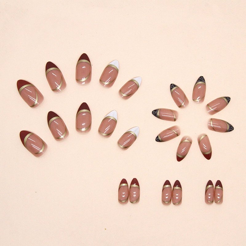 Bellelfin artificial nail are designed according to the curvature of women's fingers, with moderate thickness, perfectly blended with natural nails, more comfortable and natural to wear. The french false nails medium length with gold foil colorblocked leopard french nails designs looks fashionable, making your nails elegant and charming.