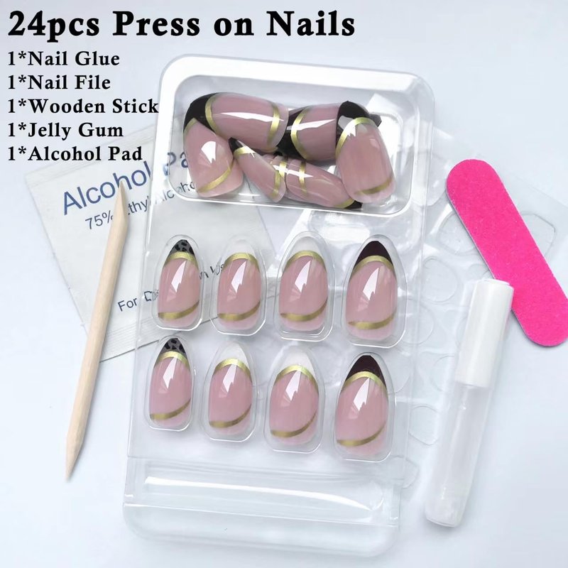 - French tip press on nails kit, content 24pcs almond press on nails with mirrors french designs for women girls teens diy nails. 1pc strong nail glue, 1pcs nail adhesive tabs. 1 nail file and 1 wooden stick. No need to buy additional materials, you can achieve the nail salon effect at home. Perfect for quickly nail art manicure and save your money and time.