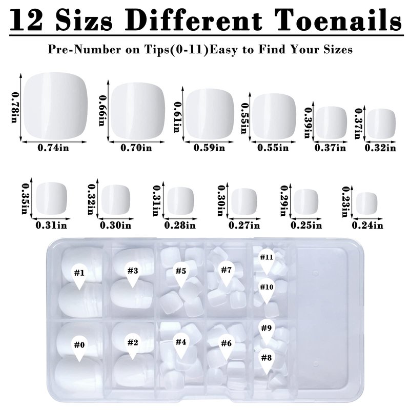 - Various sizes short toe nails press on: Short square toe press on nails have 12 different sizes, the toe nails are pre-numbered 0-11 and they are easy to track and find. Fashionable and charming artificial fake toe nails, make sure that they fit most people's feet nail, whether you have a small or large nail beds. Come to Bellelfin and choose the size that suits you best!