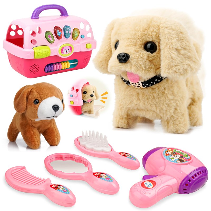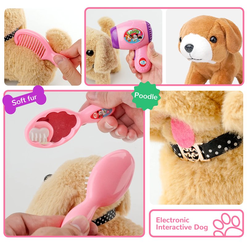 - 【Product Information】 The product contains 7 accessories: 2 cute dogs (requires 2*1.5AA batteries, not included), a dog cage (requires 2*1.5AA batteries, not included), blow dryer * 1, brush * 1, mirror * 1, comb * 1. Children can have a dog of their own! It also enhances children's sense of empathy and responsibility.