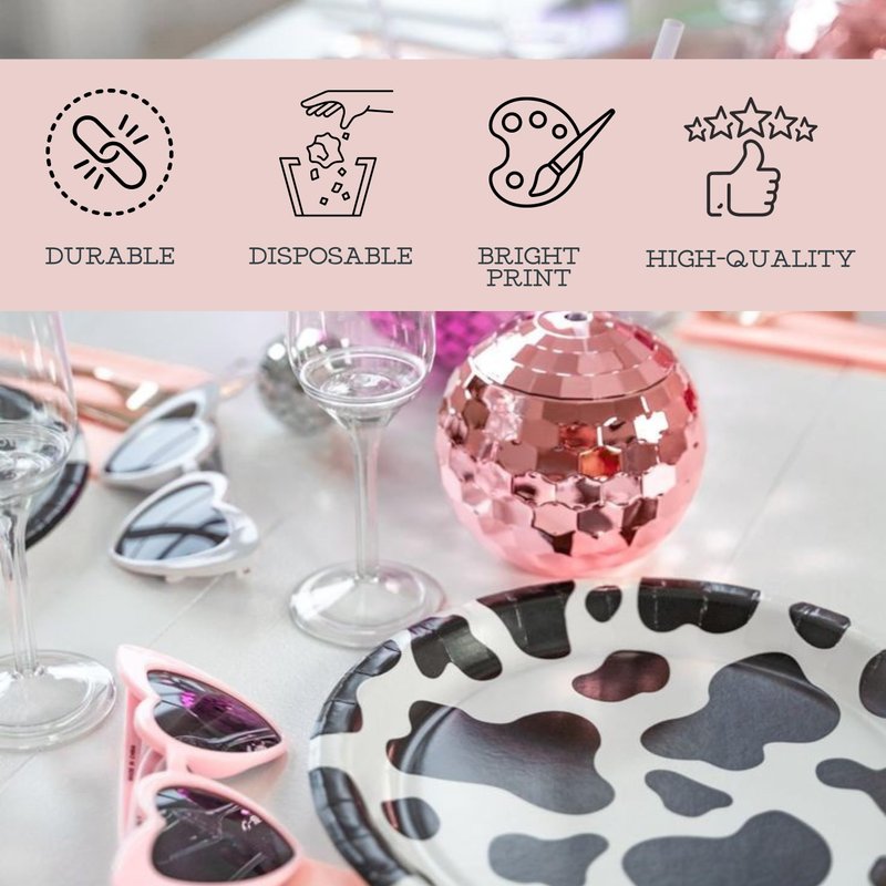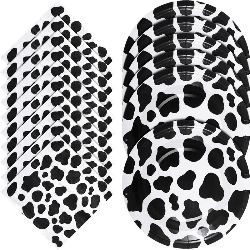 - Disposable paper plates cow pattern, cow print plates and napkins party supplies can help reduce cleaning time and increase the time to talk with guests after the party. Just collect the tablecloths with all the garbage and throw them in the trash can. This cow set of disposable plates and disposable napkins is a must-have for every cowboy party, western party, cowgirl party, farm party and other cow theme party