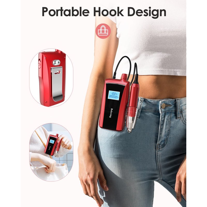 - RECHARGEABLE AND PORTABLE NAIL DRILL: Nail filer electric with a large battery capacity (2000mA), you can use it anytime, anywhere. Fully charged for about 2 hours, the electric nail file can work for 6-10 hours. The curved belt clip of the Acrylic nail drill lets you hang it around your waist belt, and it's compact enough to fit in your travel bag or suitcase. This electric nail file has forward and reverses options and is suitable for left and right-hand use.