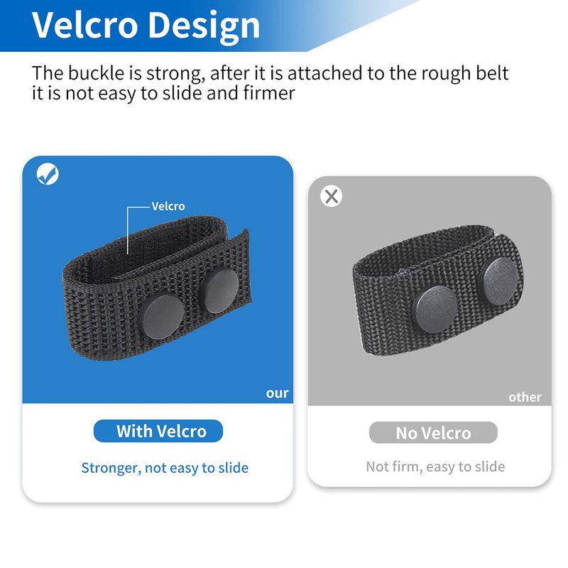 Durable design: The double snap design of belt keepers can be holding up well to repeated opening and closing of the snaps to put on and take off of a belt. Velcro design keeps your duty belt from slipping, ensuring that your work belt can be fixed in place even when running or fighting.