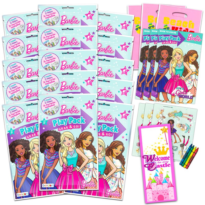 Set of 15 Playpacks. Each Playpack contains 1 childrens mini coloring book, 4 crayons, and 25 stickers. Children’s TV & movie characters for boys & girls. Barbie art coloring book set features favorite Barbie styles. Toddler coloring books Grab and Go fun for car travel & vacations. Fun for holidays, Easter basket, birthdays, and prizes. Cool party favors, supplies, art gifts, and presents. Good grade school toddler coloring book for classroom rewards and giveaways making it the best coloring book set. Kids coloring books activities for daycare, camp, parties, pre-school, kindergarten, birthday parties, coloring books for kids sleepovers, etc. Fun for boys and boys. Bulk set in resealable bags, ages 3+, especially popular party favors for kids under 5. Officially licensed Barbie toys and games products also includes bonus loot bags and a princess castle door hanger.