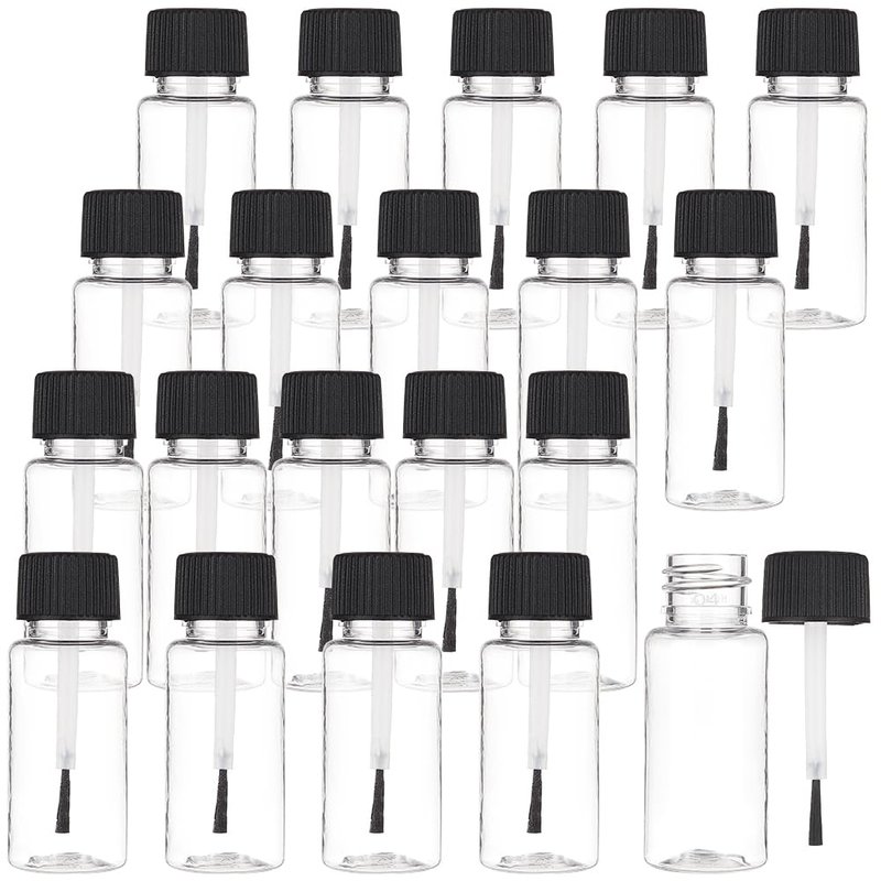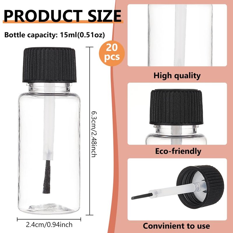 BENECREAT 20 Packs 15ml(0.5fl.oz) Plastic Brush Applicator Bottles with Black Cap, Empty Refillable Nail Polish Touch Up Bottle with Brush Top for Glue, Paint, Nail Art