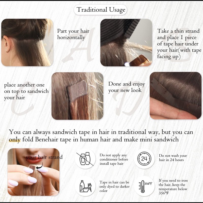 - 𝐌𝐢𝐧𝐢 𝐓𝐚𝐩𝐞 𝐇𝐚𝐢𝐫: Benehair tape-in extensions, one time use set of hair, 2nd generation of seamless tape in extensions, more invisible and natural than traditional tape in remy hairpieces in the market, can meet your need more perfectly